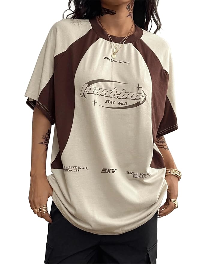 - DESIGN: Aesthetic oversized t-shirt featuring raglan sleeves with brown and cream colour blocking and inspirational text graphics